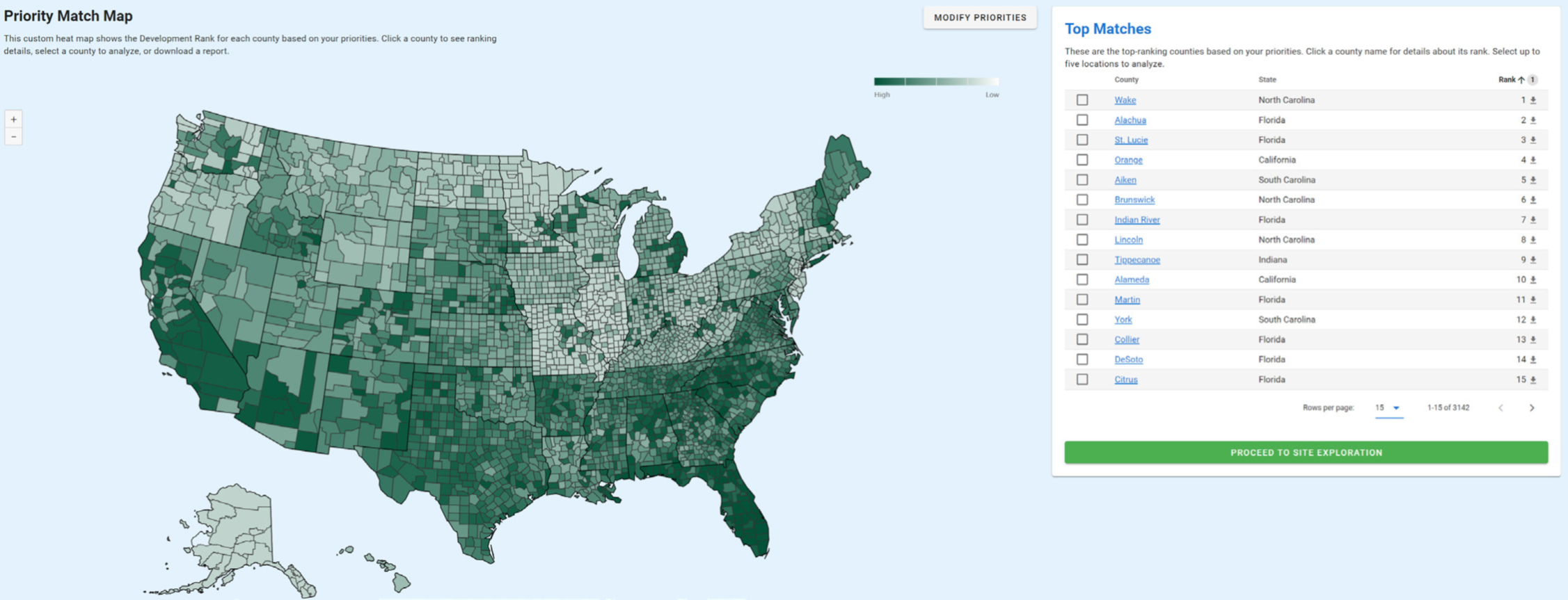 The Site Discover feature allows users to set values using a priority questionnaire. Based on the inputs, STAND will provide county level information for the U.S. This information is displayed as a priority match map with a color scale indicating top matches for the user. The information used as the basis for the results in each county may be viewed by selecting the county either on the map or in the Top Matches list.